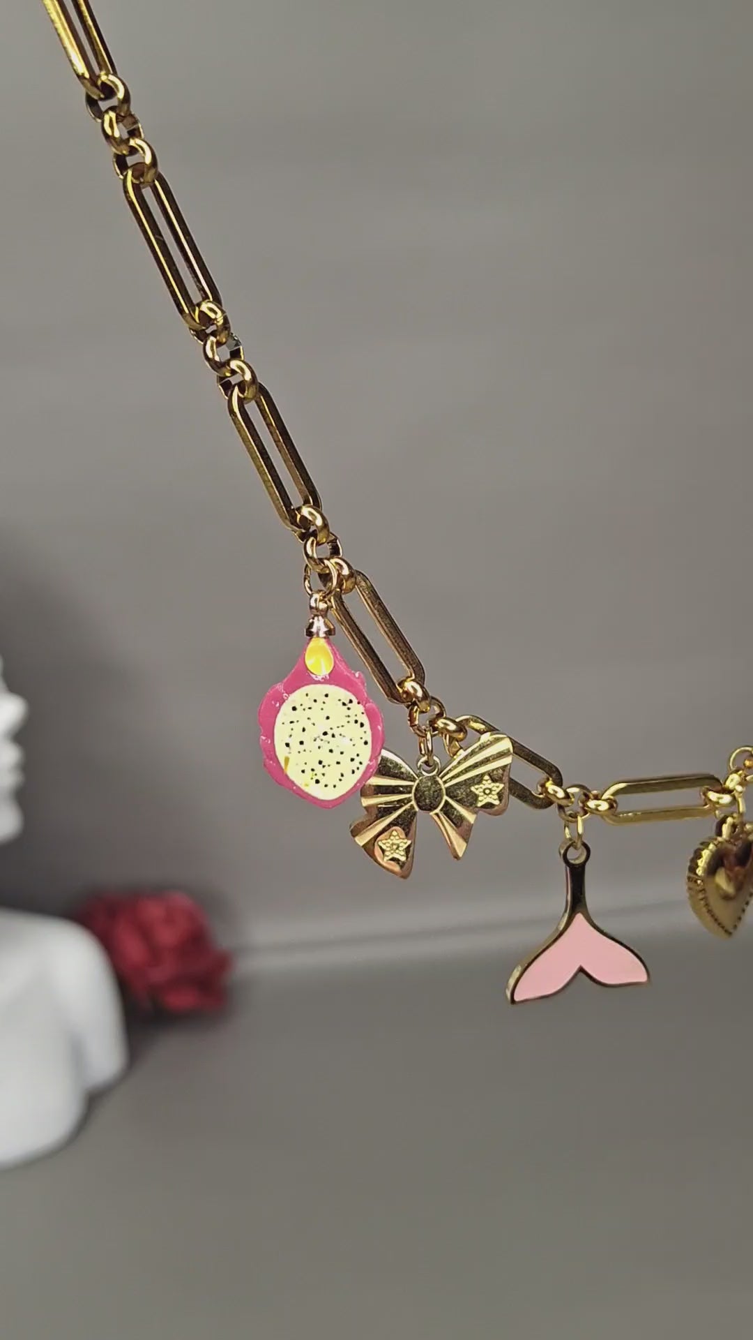 Collar de acero inoxidable 316L con enchape de oro de 18 kilates (3-5 micras) que combina elegancia y durabilidad. Diseñado con una extensión de 41 cm más 5,3 cm de ajuste, pesa 16,6 gramos. Los dijes de cola de sirena, con diámetro aproximado de 1,3 cm, están elaborados en resina y enamel, ofreciendo un acabado vibrante y resistente. Una pieza versátil que mantiene su brillo y calidad en el tiempo.